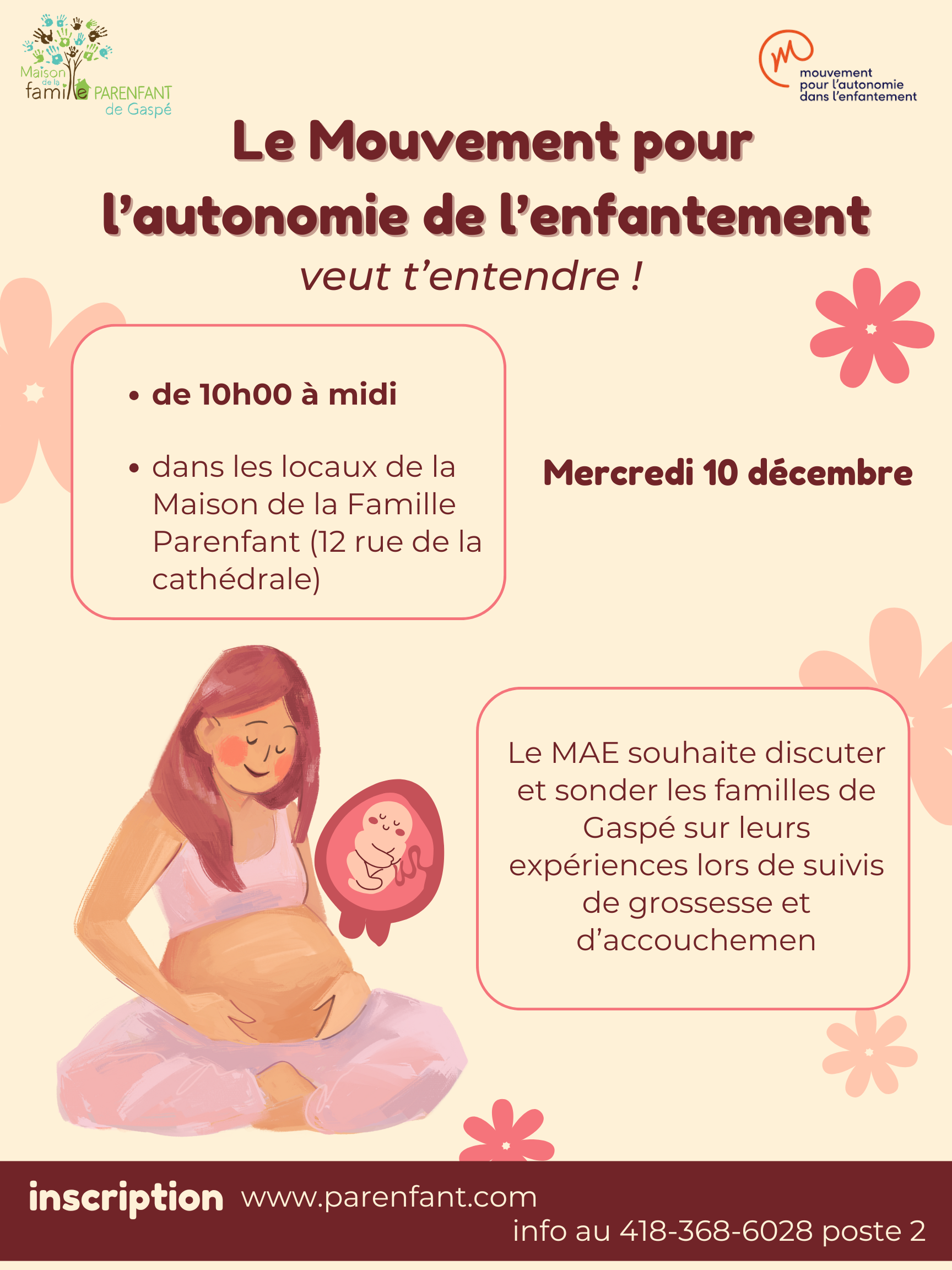 Le MAE souhaite discuter et sonder les familles de Gaspé sur leurs expériences lors de suivis de grossesse et d’accouchement